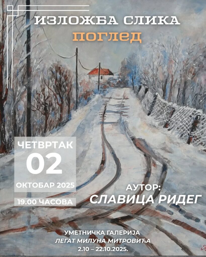 Kulturni centar Sokobanja organizuje izložbu slika „Pogled“ autorke Slavice Rideg iz Kostolca. Otvaranje izložbe je u četvrtak, 2. oktobra, u 19 časova, u Legatu Miluna Mitrovića.