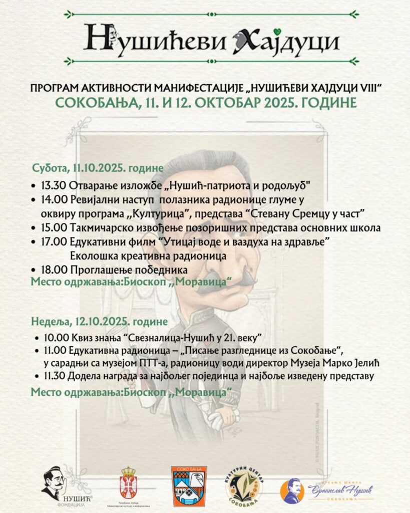 Sve škole iz Srbije i regiona koje nose ime pisca Branislava Nušića obeležavaju godišnjicu rođenja ovog velikog komediografa manifestacijom „Nušićevi hajduci“ koja će se, po osmi put, 11. i 12. oktobra, održati u Sokobanji.