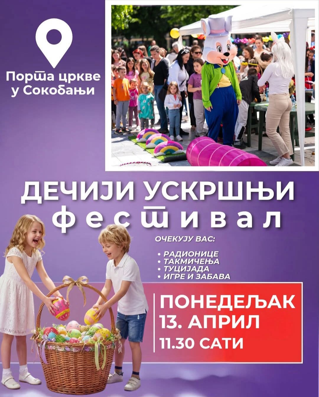 Kulturni centar Sokobanja organizuje Uskršnji festival, u ponedeljak, 13. aprila. Festival je namenjen deci i mladima, a posvećen najlepšem prolećnom prazniku, Uskrsu, kreativnosti i radosti darivanja. Na festivalu će biti kreativnih radionica, mašte, crtanja, takmičenja, druženja, igre i zabave, a sve počinje od 11.30 sati, u porti sokobanjske crkve.
